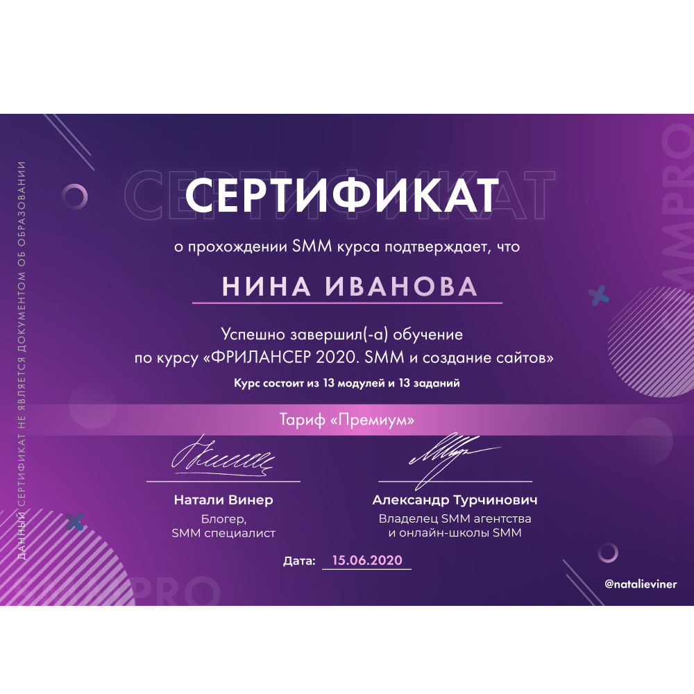 Закончила курс Фрилансер 2020: SMM и создание сайтов